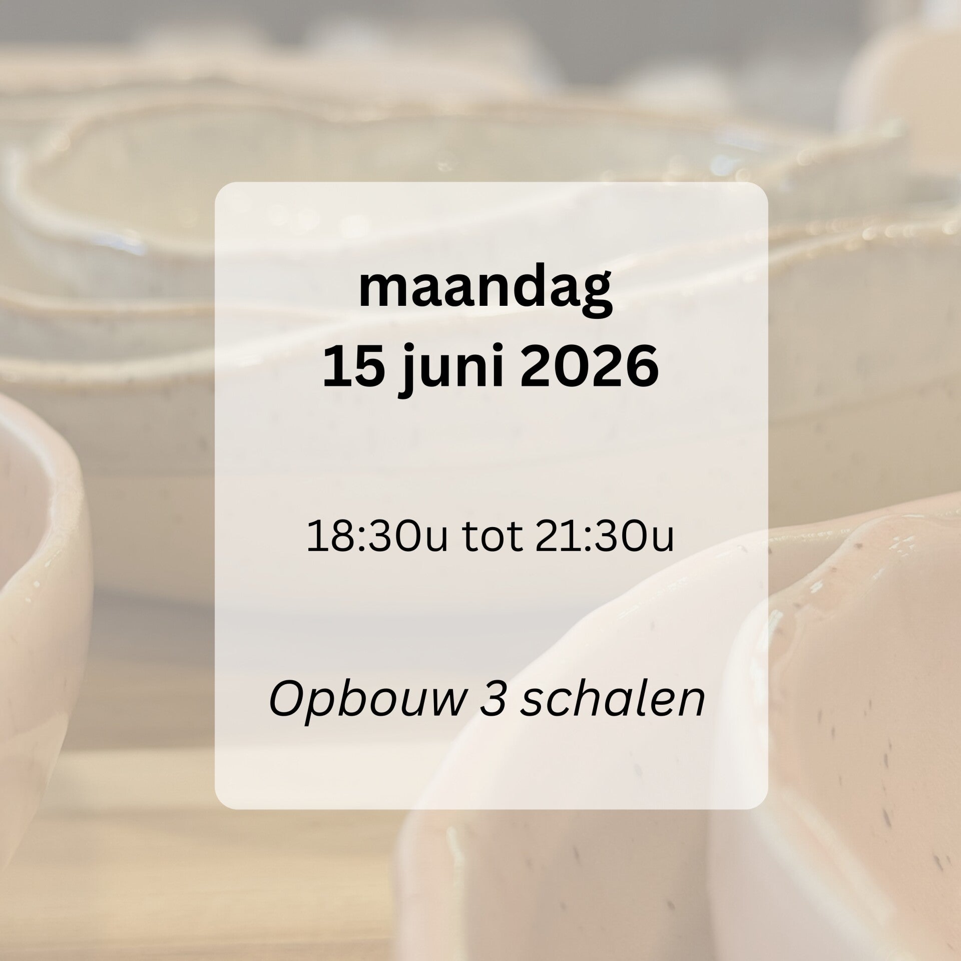 In deze workshop maak je zelf drie schalen in opbouwtechniek. We starten van kleiplaten en bouwen stap voor stap je eigen set op, volledig met de hand gevormd. ✨